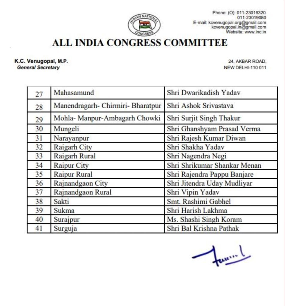 रायपुर (वनांचल न्यूज़)। छत्तीसगढ़ कांग्रेस में बड़े स्तर पर संगठनात्मक फेरबदल किया गया है। अखिल भारतीय कांग्रेस कमेटी (AICC) ने शुक्रवार को राज्य के जिला कांग्रेस कमेटियों के नए अध्यक्षों की नियुक्तियों को मंजूरी देते हुए लिस्ट जारी की है। 41 शहर और ग्रामीण अध्यक्षों की सूची जारी की गई है, जिसमें रायपुर शहर से श्रीकुमार शंकर मेनन और रायपुर ग्रामीण में राजेंद्र पप्पू बंजारे को अध्यक्ष बनाए गए हैं।00 जानिए किसे मिली किस जिले और शहर की जिम्मेदारीबालोद में चंद्रेश कुमार हिरवानी, बलौदाबाजार में सुमित्रा घृतलहरे, बलरामपुर में एडवोकेट हरिहर प्रसाद यादव, बस्तर ग्रामीण में प्रेम शंकर शुक्ला, बेमेतरा में आशीष छाबड़ा, भिलाई शहर में मुकेश चंद्राकर, बीजापुर में लालू राठौर, बिलाईगढ़-सारंगढ़ में ताराचंद देवांगन, बिलासपुर शहर में सिद्धांशु मिश्रा, बिलासपुर ग्रामीण में महेंद्र गंगोत्री, दंतेवाड़ा में सलीम राजा उस्मानी, धमतरी में तारिनी चंद्राकर, दुर्ग ग्रामीण में धीरज बाकलीवाल, दुर्ग शहर में राकेश ठाकुर, गरियाबंद में सुखचंद बेसरा, गौरेला-पेंड्रा-मरवाही में गजमती भानु, जगदलपुर शहर में सुशील कुमार मौर्य, जांजगीर-चांपा में राजेश अग्रवाल, जशपुर में यू.डी. मिंज, कांकेर में बसंत यादव, कबीरधाम (कवर्धा) में नवीन जायसवाल, खैरागढ़-छुईखदान-गंडई में कोमलदास साहू, कोंडागांव में रवि घोष, कोरबा शहर में मुकेश कुमार राठौर, कोरबा ग्रामीण में मनोज चौहान, कोरिया में प्रदीप कुमार गुप्ता को जिला अध्यक्ष की जिम्मेदारी सौंपी गई है।इसी प्रकार महासमुंद में द्वारिकाधीश यादव, मनेंद्रगढ़-चिरमिरी-भरतपुर में अशोक श्रीवास्तव, मोहला-मानपुर-अंबागढ़ चौकी में सुरजीत सिंह ठाकुर, मुंगेली में घनश्याम प्रसाद वर्मा, नारायणपुर में राजेश कुमार दीवान, रायगढ़ शहर में शखा यादव, रायगढ़ ग्रामीण में नागेंद्र नेगी, रायपुर शहर में श्रीकुमार शंकर मेनन, रायपुर ग्रामीण में राजेंद्र पप्पू बंजारे, राजनांदगांव शहर में जितेंद्र उदय मुदलियार, राजनांदगांव ग्रामीण में विपिन यादव, सक्ति में रश्मि गभेल, सुकमा में हरीश लखमा, सूरजपुर में शशि सिंह कोर्राम, सरगुजा में बलकृष्ण पाठक को जिला अध्यक्ष नियुक्त किया गया है।देखिये नए जिला अध्यक्षों की लिस्ट :–