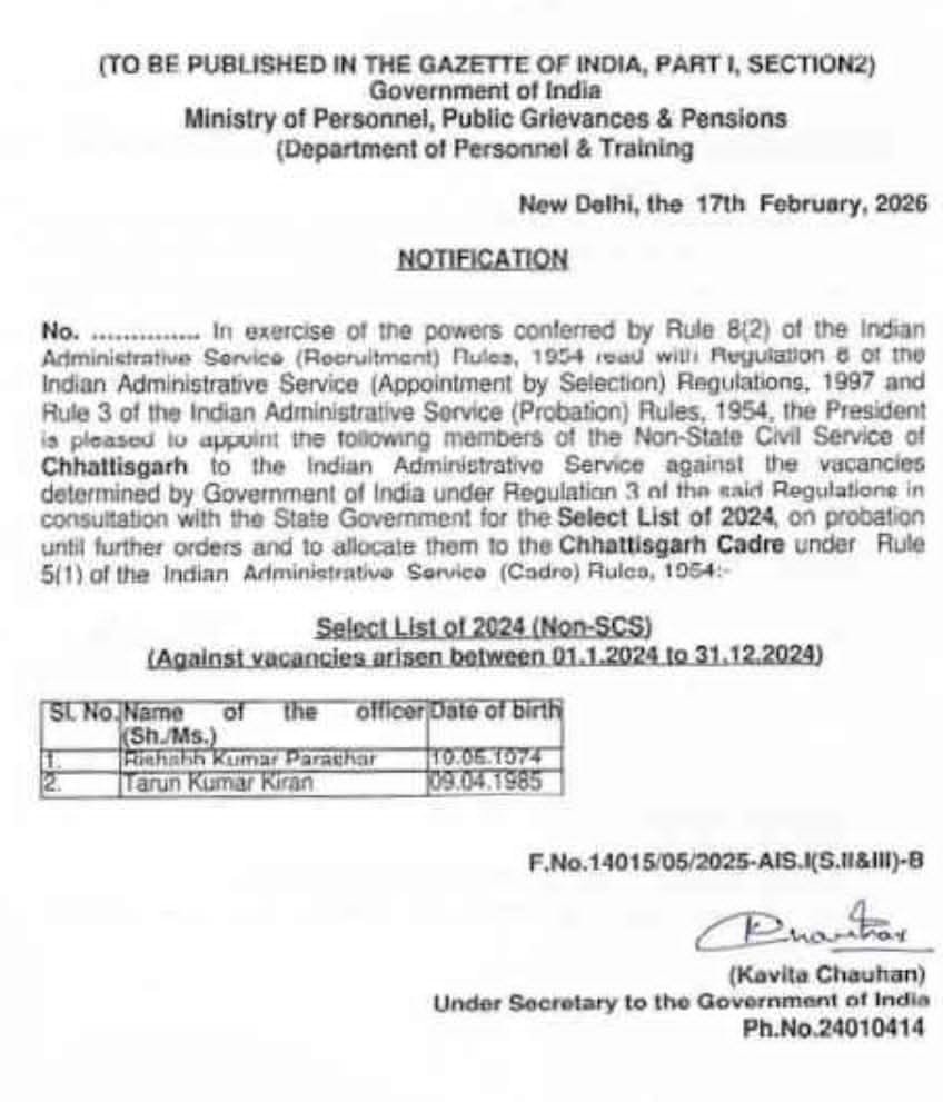 रायपुर (वनांचल न्यूज़)। केंद्र सरकार के कार्मिक, लोक शिकायत एवं पेंशन मंत्रालय (कार्मिक एवं प्रशिक्षण विभाग) ने अधिसूचना जारी कर छत्तीसगढ़ के दो अलाइड सर्विस अधिकारियों को भारतीय प्रशासनिक सेवा (आईएएस) में नियुक्त किया है। यह नियुक्ति वर्ष 2024 की चयन सूची (नॉन-एससीएस) के अंतर्गत की गई है ।जारी आदेश के अनुसार, 1 जनवरी 2024 से 31 दिसंबर 2024 के बीच उत्पन्न रिक्तियों के विरुद्ध चयन करते हुए ऋषभ कुमार पराशर और तरुण कुमार किरण को आईएएस में पदोन्नत किया गया है। यह नियुक्ति भारतीय प्रशासनिक सेवा (भर्ती) नियम, 1954 तथा संबंधित विनियमों के तहत की गई है । ऋषभ पराशर राज्य वित्त सेवा और तरुण कुमार किरण जीएसटी विभाग के अधिकारी हैं ।