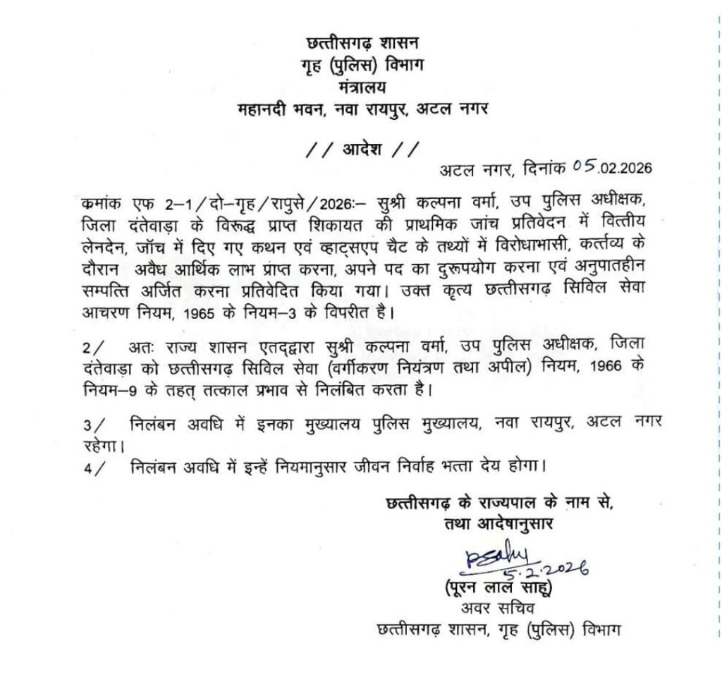 रायपुर (वनांचल न्यूज़)। छत्तीसगढ़ शासन ने दंतेवाड़ा जिले में तैनात डीएसपी कल्पना वर्मा को तत्काल प्रभाव से निलंबित कर दिया है। गृह विभाग ने जारी आदेश में बताया कि निलंबन का कारण उनके खिलाफ प्रारंभिक जांच में सामने आए गंभीर आरोप हैं।