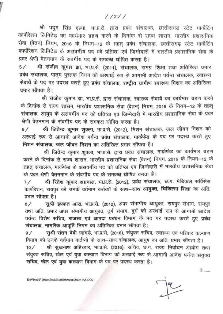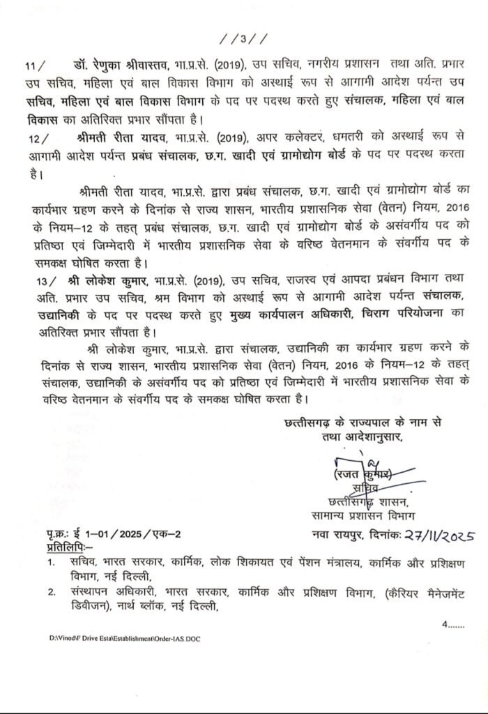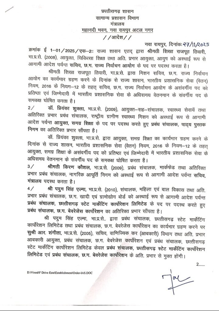रायपुर (वनांचल न्यूज़) । साय सरकार ने बड़े पैमाने पर प्रशासनिक फेरबदल किया है। 13 आईएएस अफसरों की नई पदस्थापना आदेश जारी किया गया है। आदेश के मुताबिक, आईएएस शिखा राजपूत तिवारी को छत्तीसगढ़ राज्य निर्वाचन आयोग के सचिव की जिम्मेदारी दी गई है।आईएएस शिखा राजपूत तिवारी, आयुक्त चिकित्सा शिक्षा एवं अति. प्रभार आयुक्त आयुष को अस्थायी रूप से आगामी आदेश पर्यन्त सचिव, छग राज्य निर्वाचन आयोग के पद पर पदस्थ किया गया है। आईएएस डॉ. प्रियंका शुक्ला, आयुक्त-सह-संचालक, स्वास्थ्य सेवायें तथा अतिरिक्त प्रभार प्रबंध संचालक, राष्ट्रीय ग्रामीण स्वास्थ्य मिशन को अस्थायी रूप से आगामी आदेश पर्यंत आयुक्त, समग्र शिक्षा के पद पर पदस्थ करते हुए प्रबंध संचालक, पाठ्य पुस्तक निगम का अतिरिक्त प्रभार सौंपा गया है।आईएएस किरण कौशल, प्रबंध संचालक मार्कफेड एवं अतिरिक्त प्रभार प्रबंध संचालक, नागरिक आपूर्ति निगम को अस्थाई रूप से आगामी आदेश पर्यन्त सचिव मंत्रालय पदस्थ किया गया है। आईएएस पदुम सिंह एल्मा, संचालक महिला एवं बाल विकास तथा अति. प्रभार प्रबंध संचालक छग खादी एवं ग्रामोद्योग बोर्ड को अस्थाई रूप से आगामी आदेश पर्यंत प्रबंध संचालक, छत्तीसगढ़ स्टेट मार्केटिंग कार्पोरेशन लिमिटेड के पद पर पदस्थ करते हुए प्रबंध संचालक, छग बेवरेजेस कार्पोरेशन का अतिरिक्त प्रभार सौंपा गया है।आईएएस पदुम सिंह एल्मा द्वारा प्रबंध संचालक छत्तीसगढ़ स्टेट मार्केटिंग कार्पोरेशन लिमिटेड तथा प्रबंध संचालक, छग बेवरेजेस कार्पोरेशन का कार्यभार ग्रहण करने पर आईएएस आर. संगीता, सचिव वाणिज्यिक कर (आबकारी) विभाग तथा अति. प्रभार आबकारी आयुक्त, प्रबंध संचालक, छग बेवरेजेस कार्पोरेशन एवं प्रबंध संचालक, छत्तीसगढ़ स्टेट मार्केटिंग कार्पोरेशन लिमिटेड केवल प्रबंध संचालक, छत्तीसगढ़ स्टेट मार्केटिंग कार्पोरेशन लिमिटेड एवं प्रबंध संचालक, छग बेवरेजेस कार्पोरेशन के अति. प्रभार से मुक्त होंगी।आईएएस संजीव कुमार झा, संचालक समग्र शिक्षा तथा अतिरिक्त प्रभार प्रबंध संचालक, पाठ्य पुस्तक निगम को अस्थाई रूप से आगामी आदेश पर्यन्त संचालक स्वास्थ्य सेवायें के पद पर पदस्थ करते हुए प्रबंध संचालक राष्ट्रीय ग्रामीण स्वास्थ्य मिशन का अतिरिक्त प्रभार सौंपा गया है। आईएएस जितेन्द्र कुमार शुक्ला, मिशन संचालक जल जीवन मिशन को अस्थाई रूप से आगामी आदेश पर्यन्त प्रबंध संचालक, मार्कफेड के पद पर पदस्थ करते हुए मिशन संचालक, जल जीवन मिशन का अतिरिक्त प्रभार सौंपा गया है।आईएएस रितेश कुमार अग्रवाल, प्रबंध संचालक छग मेडिकल सर्विसेस कार्पोरेशन रायपुर को उनके वर्तमान कर्तव्यों के साथ-साथ आयुक्त, चिकित्सा शिक्षा का अति. प्रभार सौंपा गया है। आईएएस इफ्फत आरा, 