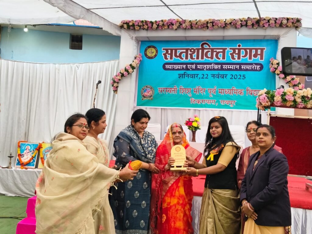 रायपुर (वनांचल न्यूज़)। माधव बाल कल्याण समिति द्वारा संचालित सरस्वती शिशु मंदिर, टिकरापारा, रायपुर में शताब्दी वर्ष के अंतर्गत “सप्तशक्ति संगम 2025” के अवसर पर व्याख्यान एवं मातृशक्ति सम्मान समारोह का आयोजन किया गया। कार्यक्रम की अध्यक्षता डॉ. कविता कुम्भज, डायरेक्टर पारस इंस्टीट्यूट ऑफ एजुकेशन ने की। कार्यक्रम में वक्ता के रूप में श्रीमती वर्षा मिश्रा, रायपुर विभाग बौद्धिक प्रमुख – राष्ट्रीय सेविका समिति, तथा श्रीमती शीला शर्मा, आहार विशेषज्ञ – बालगोपाल चिल्ड्रन हॉस्पिटल उपस्थित रहीं।कार्यक्रम की अध्यक्ष डॉ. कविता कुम्भज ने कहा कि यह कार्यक्रम मातृशक्ति को सशक्त बनाने की दिशा में एक अनूठा प्रयास है। उन्होंने कहा कि सशक्त महिला ही सशक्त समाज के निर्माण की आधारशिला होती है।वक्ता श्रीमती शीला शर्मा ने अपने उद्बोधन में कहा कि कुटुंब प्रबोधन का उद्देश्य परिवार के सदस्यों को साथ बैठकर भोजन करने और पारिवारिक सामंजस्य बढ़ाने के लिए प्रेरित करना है। परिवार में मातृशक्ति की भूमिका अत्यंत महत्वपूर्ण होती है। उन्होंने कहा कि कुटुंब प्रबोधन एवं पर्यावरण संरक्षण आज की आवश्यकता है, क्योंकि यदि हम पर्यावरण को सुरक्षित रखेंगे तो हमारा परिवार एवं समाज भी सुखी और स्वस्थ रहेगा। आपसी सहयोग और मेल–जोल से ही हम एक सशक्त समाज का निर्माण कर सकते हैं।वक्ता श्रीमती वर्षा मिश्रा ने कहा कि देवी अहिल्याबाई होलकर ने सामाजिक एवं महिला सशक्तिकरण के क्षेत्र में उल्लेखनीय योगदान दिया। झांसी की रानी लक्ष्मीबाई ने अंग्रेजों के विरुद्ध वीरतापूर्वक संघर्ष करते हुए देश के लिए अपना बलिदान दिया। उन्होंने बताया कि इंफोसिस की निदेशक द्वारा गरीब महिलाओं को आर्थिक सहायता, बेटियों की शिक्षा तथा उन्हें सशक्त बनाने जैसे महत्वपूर्ण कार्य किए गए। राजनीतिक क्षेत्र में भी महिलाओं का योगदान अत्यंत महत्वपूर्ण है – जैसे श्रीमती सरोजिनी नायडू, श्रीमती सुषमा स्वराज, राष्ट्रपति श्रीमती द्रौपदी मुर्मू, वित्त मंत्री श्रीमती निर्मला सीतारमण, तथा श्रीमती सुमित्रा महाजन सहित अनेक महिलाओं ने राष्ट्रनिर्माण में अपनी महत्वपूर्ण भूमिका निभाई है।कार्यक्रम में श्रीमती संध्या शर्मा एवं श्रीमती मनोरमा तिवारी को विशिष्ट नारी शक्ति सम्मान से सम्मानित किया गया।