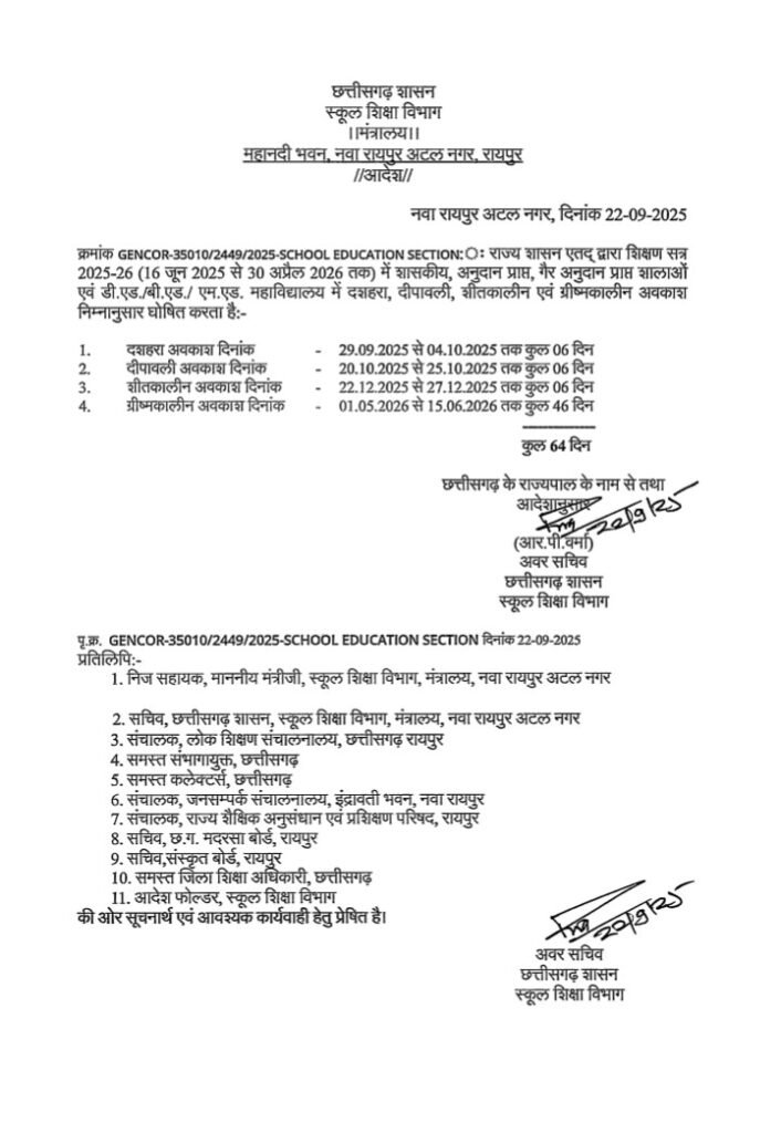 रायपुर (वनांचल न्यूज़) | स्कूल शिक्षा विभाग के अवर सचिव आर.पी वर्मा के हस्ताक्षर से आज देर शाम दशहरा,दीपावली,शीतकालीन व गर्मी अवकाश की तारीख विभाग की ओर से घोषित कर दी गई है। दशहरा अवकाश- 29-9-2025 से 4-10-2025। दीपावली अवकाश- 20-10-2025 से 25-10-2025 । शीतकालीन अवकाश- 22-12-2025 से 27-12-2025। ग्रीष्मकालीन अवकाश- 1-5-2026 से 15-6-2026 |