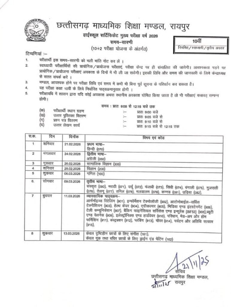 रायपुर (वनांचल न्यूज़) | बोर्ड एग्जाम के स्टूडेंट्स के लिए बड़ी खबर सामने आई है। बता दें छत्तीसगढ़ बोर्ड ऑफ़ सेकेंडरी एजुकेशन (CGBSE) ने नए साल से पहले 10वीं और 12वीं बोर्ड एग्जाम (CG Board Time Table) का पूरा टाइमटेबल जारी कर दिया है। बोर्ड सेक्रेटरी पुष्पा साहू ने बताया कि इस साल एग्जाम फरवरी के आखिरी हफ्ते में शुरू होंगे।शुरुआत: 20 फरवरी 2026समाप्ति: 18 मार्च 202610वीं बोर्ड परीक्षाशुरुआत: 21 फरवरी 2026समाप्ति: 13 मार्च 202600 6 लाख छात्र-छात्राएँ होंगे शामिलबोर्ड ने स्पष्ट किया है कि होली पर कोई एग्जाम नहीं है। इस साल, लगभग 600,000 स्टूडेंट्स 10वीं और 12वीं क्लास के एग्जाम देंगे। टाइम टेबल (CG 10th Exam Schedule 2026) जारी होने के बाद, स्टूडेंट्स और पेरेंट्स ने अपनी तैयारी तेज़ कर दी है। बोर्ड का कहना है कि एग्जाम शांति से और आसानी से कराने के लिए सभी तैयारियां कर ली गई हैं।